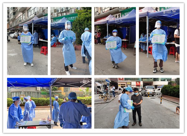 尽管当天的温度高达30摄氏度,穿上防护服更是全身湿透。但队员们没有畏缩,全情投入、恪尽职守,一直连轴转至晚上8:30,全天为1万余名群众提供检测服务。